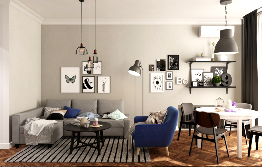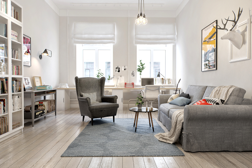 Chambre-salon dans le style scandinave est décoré dans une palette légère