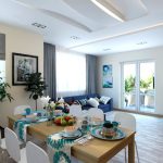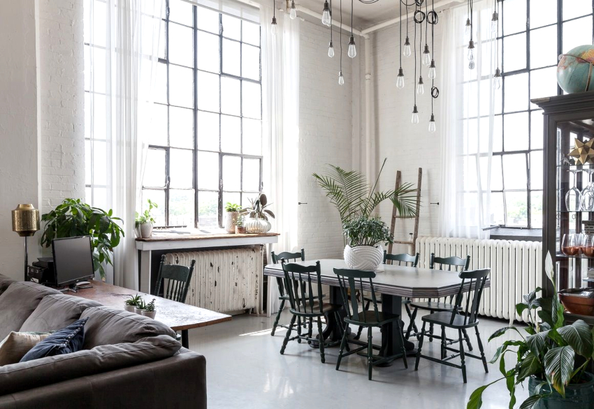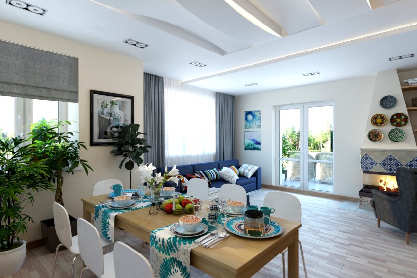 Dans le salon spacieux, vous pouvez trouver de la place pour une petite table à manger qui ne doit pas être recouverte d'une nappe. Vous pouvez y mettre un vase de fruits ou de fleurs. Les pots en argile avec des plantes d'intérieur auront également un aspect organique.