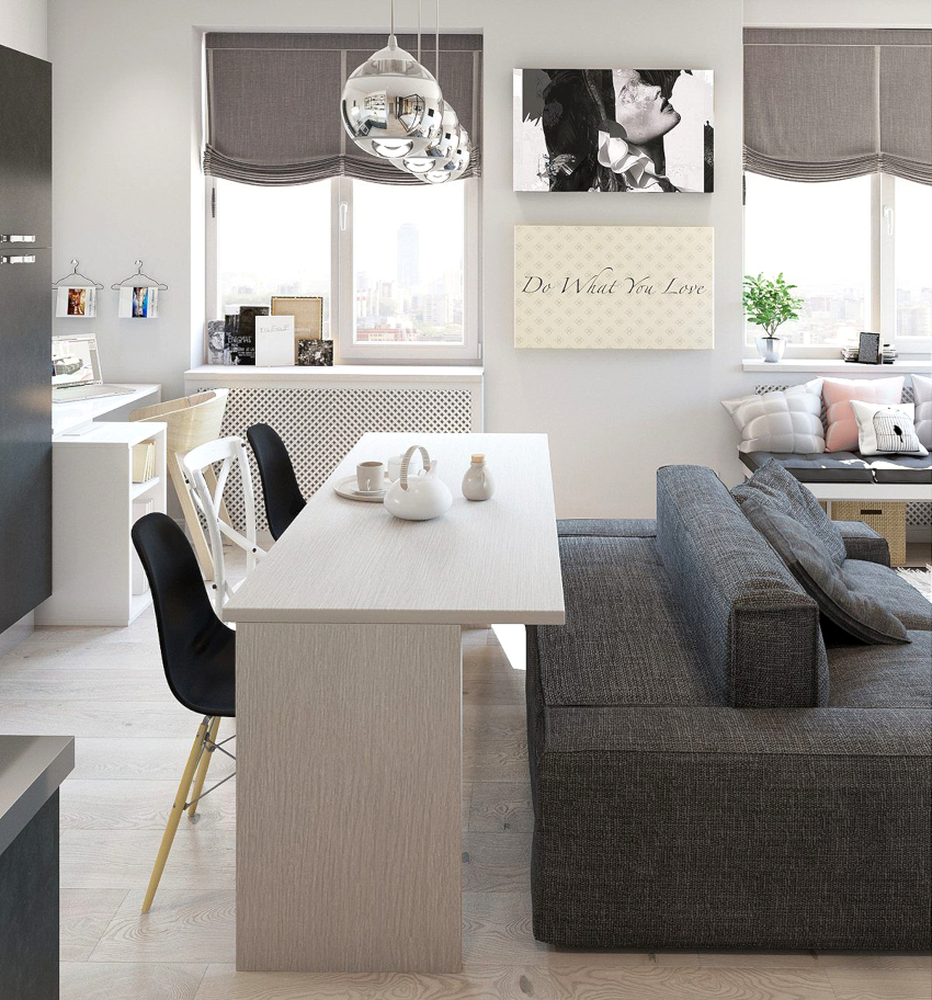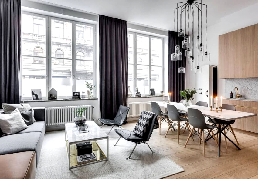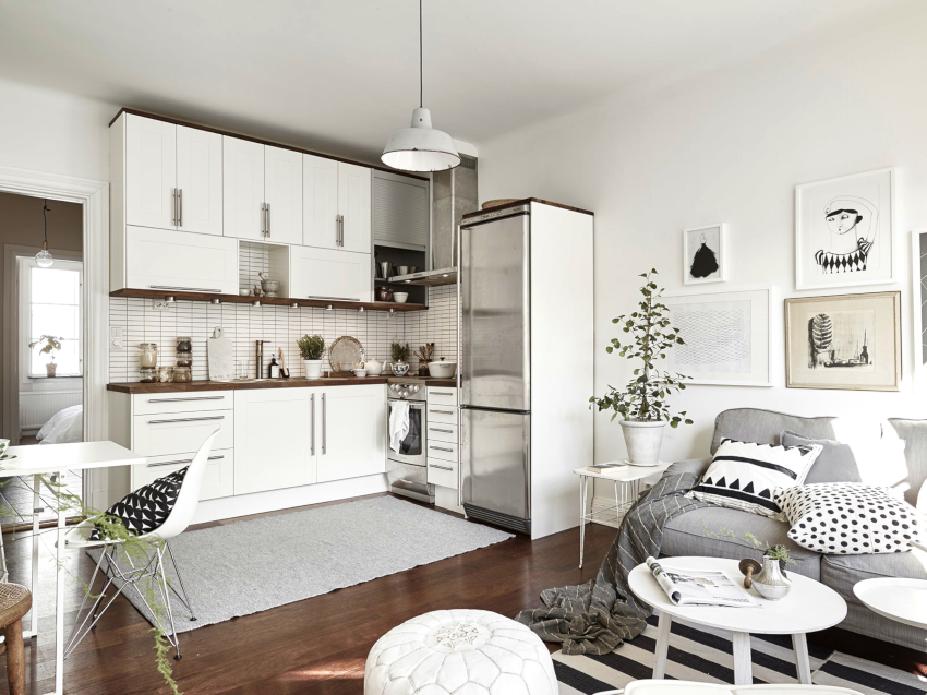 Cuisine-salon de style scandinave: photo des intérieurs de la pièce