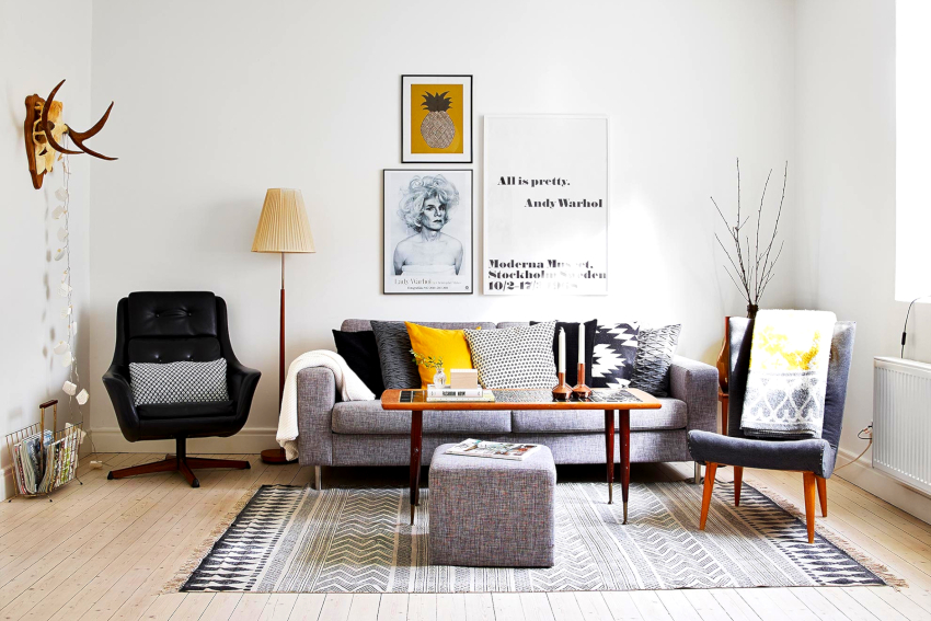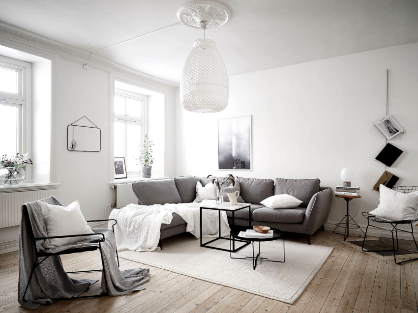 Textiles et décoration du salon dans un style scandinave: photo des intérieurs de la pièce
