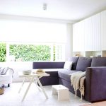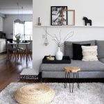 Une petite table basse à roulettes doit être placée devant le canapé. Il peut être entièrement en bois ou équipé d'un plateau en verre. Pour ranger diverses choses et accessoires, vous pouvez installer une petite armoire en bois avec un grand nombre d'étagères ouvertes ou un rack sur tout le mur. Les meubles sont sélectionnés dans des tons naturels ou blanchis, en blanc ou en gris clair.