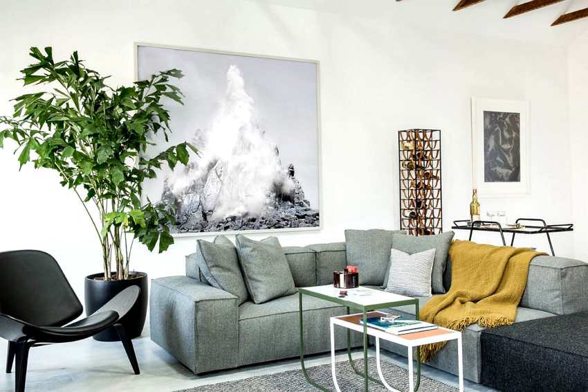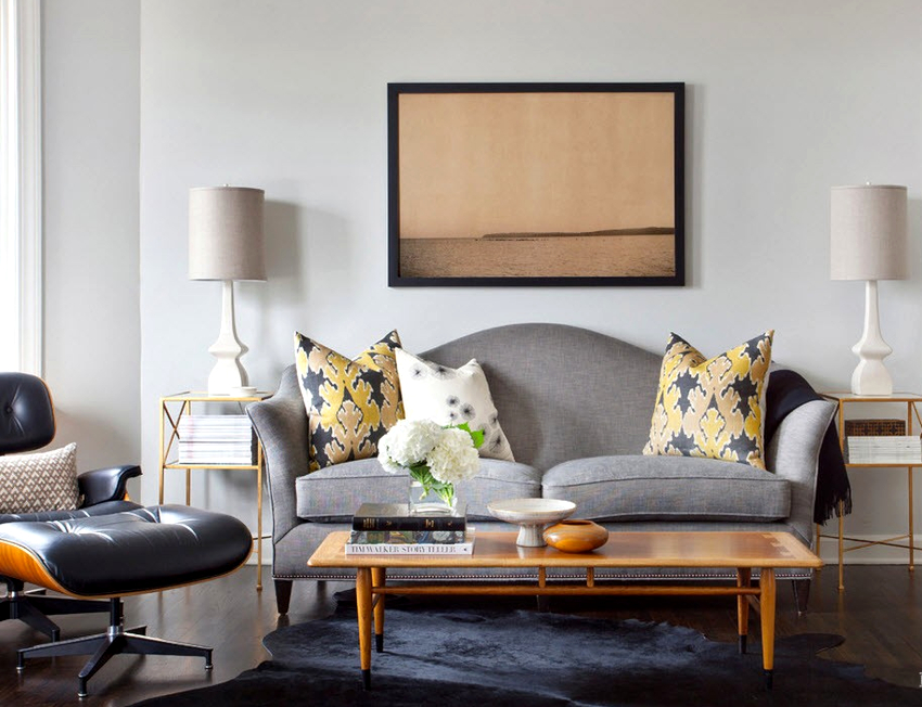Les intérieurs scandinaves ne tolèrent pas les excès de mobilier. Le concept global doit être simple et concis. Cependant, ce sont les éléments de décoration lumineux et originaux qui donnent l'expressivité caractéristique à l'intérieur gris-blanc du salon. Les produits en porcelaine, les souvenirs en métal, le plâtre, le bois et la céramique auront l'air organique ici. L'artisanat deviendra le point culminant de la salle.La photo au-dessus du canapé a l'air originale à l'intérieur du salon (la photo le montre clairement), réalisée dans un style rétro ou représentant des paysages de montagne enneigés. Vous pouvez accrocher plusieurs photos de famille dans des cadres en bois.