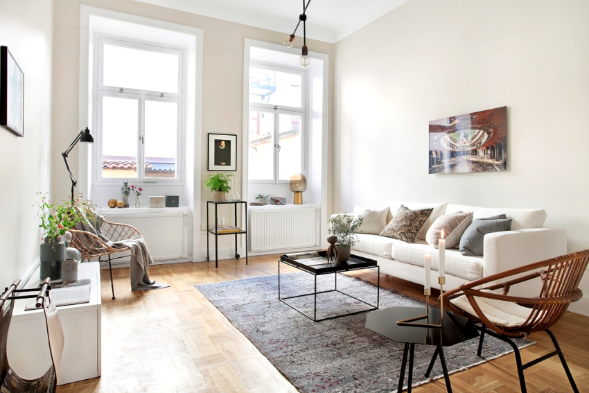 Conseil utile! Les produits en rotin léger s'intégreront harmonieusement dans l'intérieur scandinave. Ceux-ci peuvent être des chaises, des tables ou des poufs.