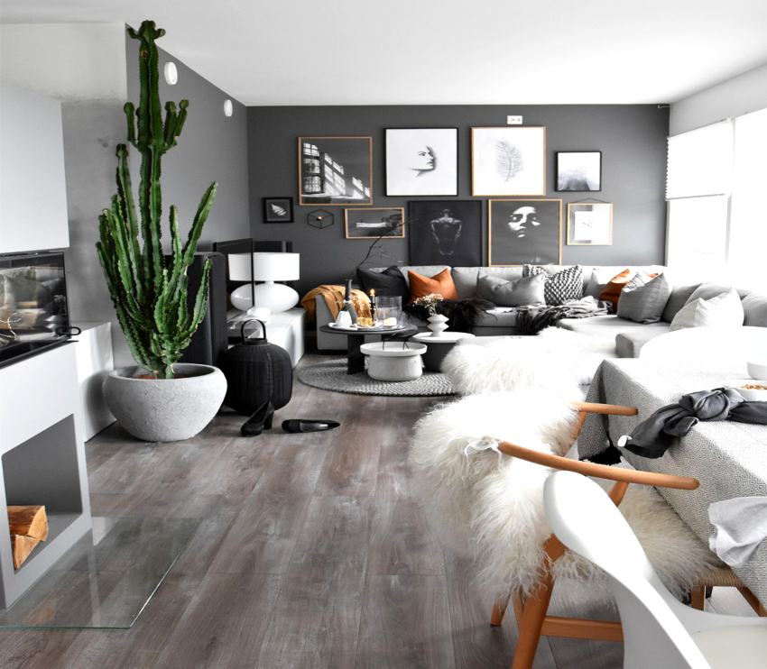 Conseil utile! Les murs simples et froids d'un salon scandinave peuvent être décorés avec des décalcomanies décoratives représentant des plantes telles qu'un arbre de Noël ou un pissenlit.