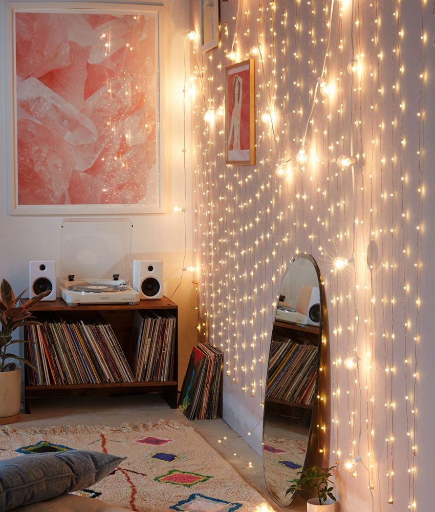 Postoje razne mogućnosti za ukrašavanje zidova vijencima. U ovom slučaju, glavna stvar je ne pretjerivati: ponekad je dovoljna jedna svjetlucava nit koja stvara atmosferu čarolije. Lampioni izgledaju posebno elegantno na bijelom ili opečnom zidu.