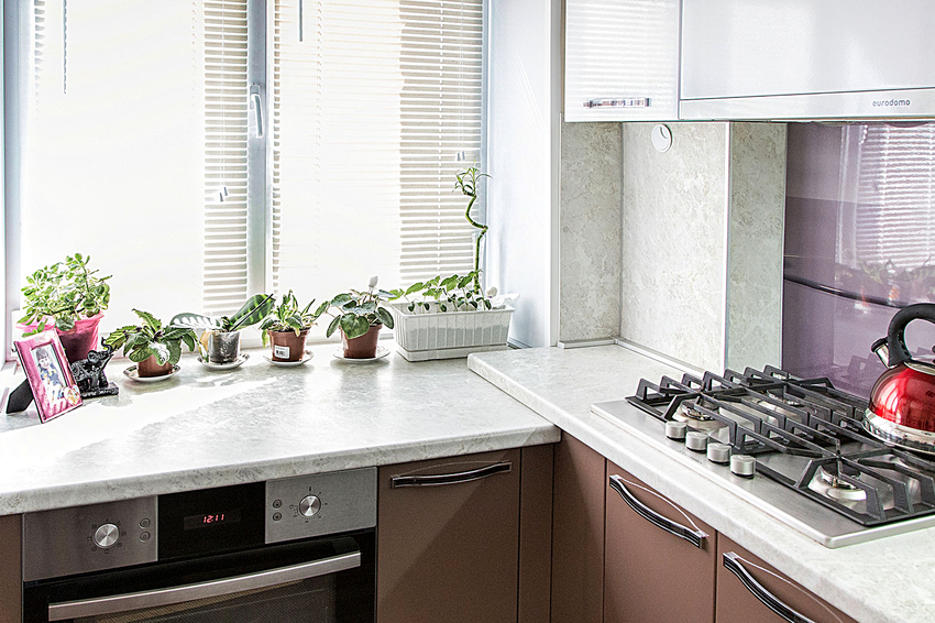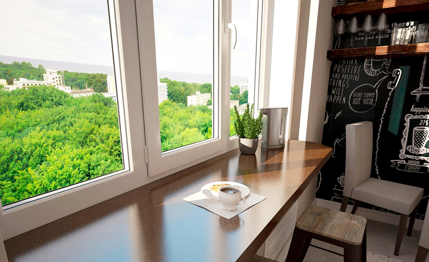 Műszaki szempontból a legegyszerűbb megoldás az, ha konyhai vonalat építünk az ablakpárkány tetejére, miközben akár két tíz centimétert is hagyunk, hogy kinyissuk az ablakszárnyat és szellőztessük a szobát. A bútorok és az üveg közötti "barázda" növényi cserepekkel zárható le. Ez nem a leg ergonómikusabb, de a leggazdaságosabb megoldás. A bútorok telepítése során nem lesz szükség az üvegegység cseréjére és trükkökre.