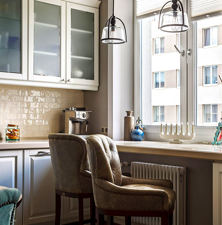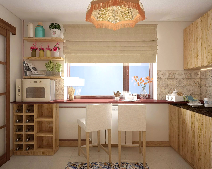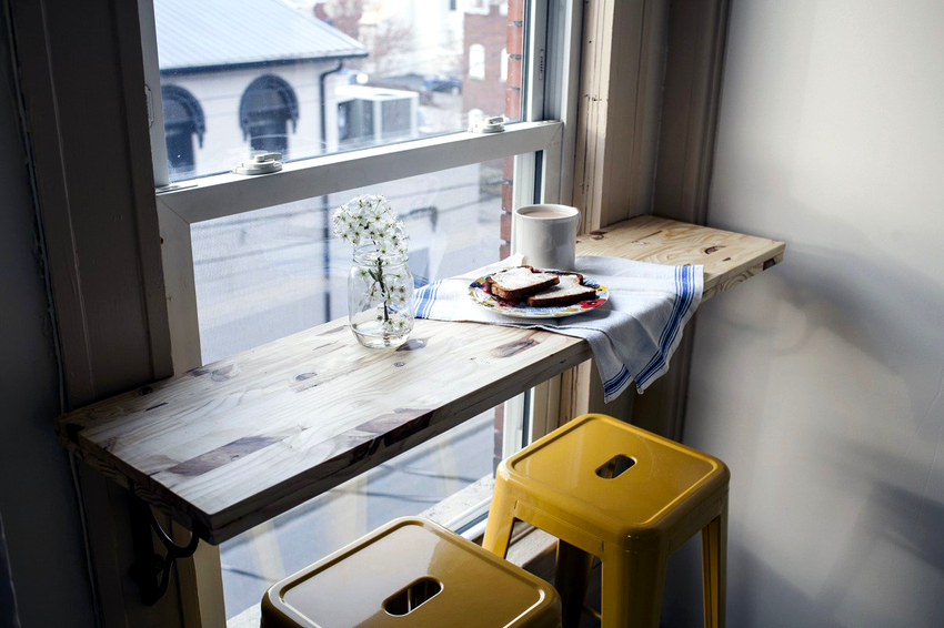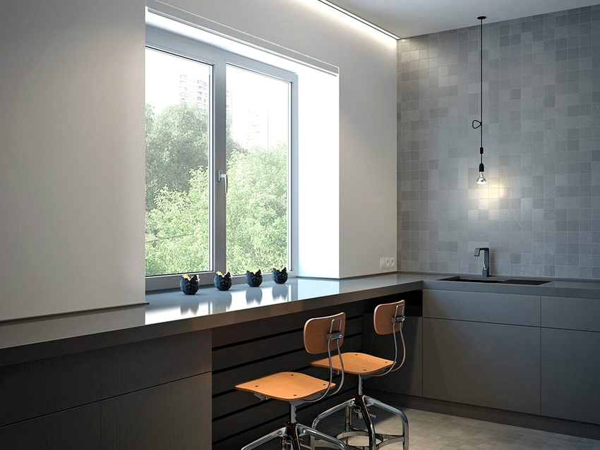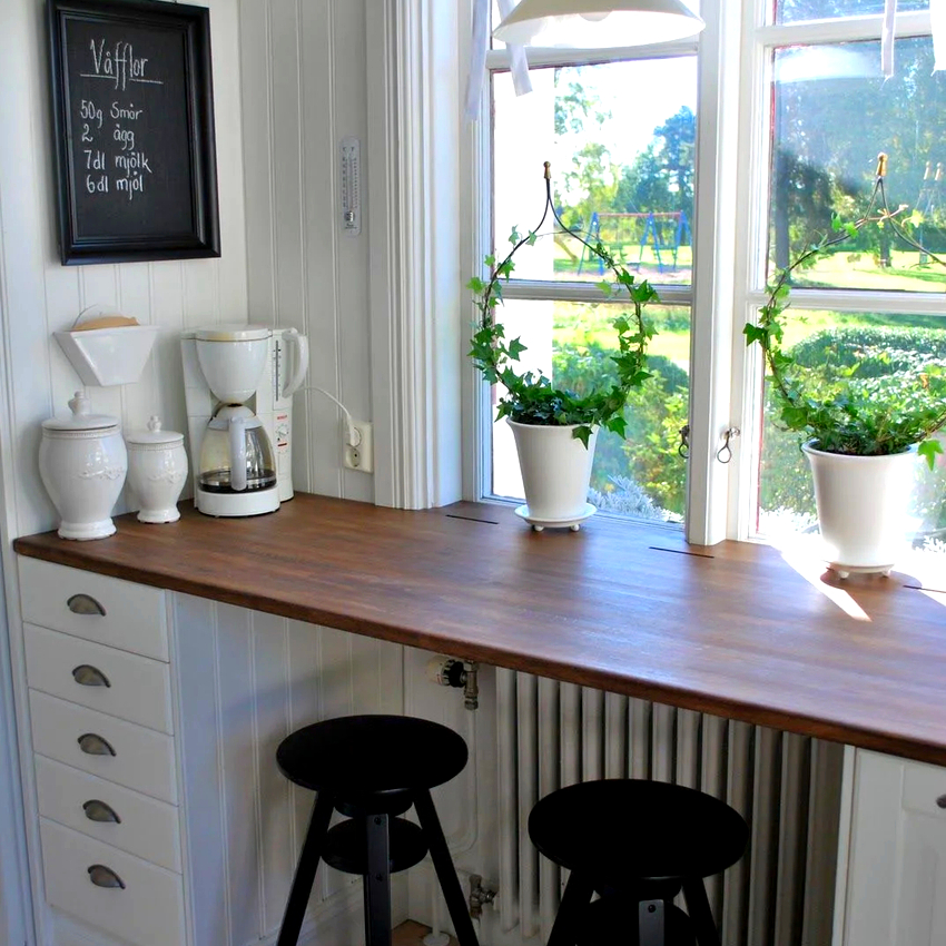 Ez a megoldás a legkevésbé jellemző a tervezők körében abban az esetben, ha az ablak közelében helyet rendeznek. Mindazonáltal a konyhában egy ablakpárkány helyett egy rögtönzött ebédlőasztalként használható pult kiválóan alkalmas a tér racionalizálására.