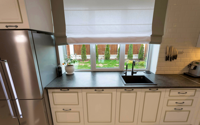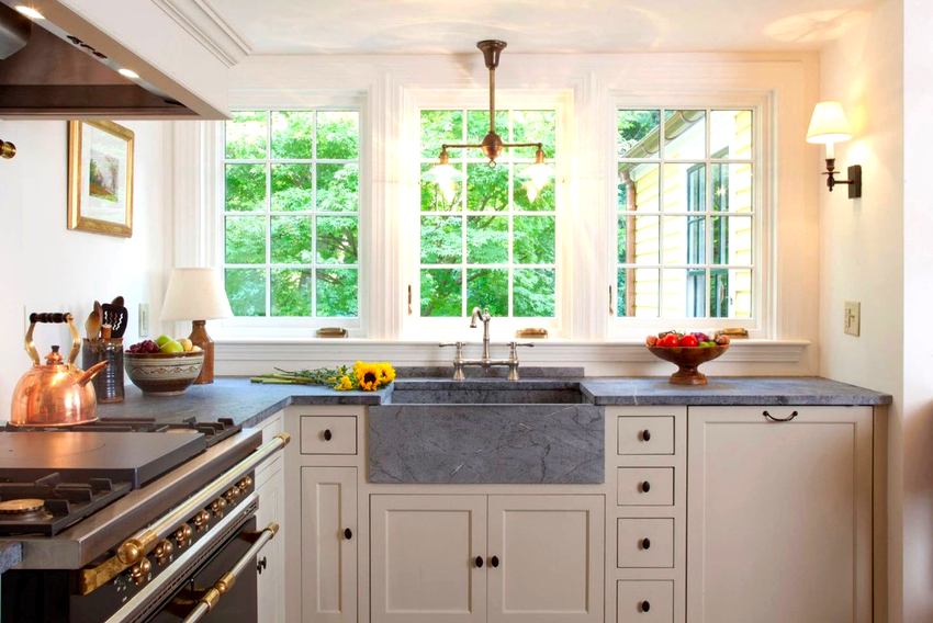 - Az egyetlen kivétel a három szárnyú ablak. Ebben az esetben a mosogató a vakfedéllel szemben helyezkedik el, középen helyezkedik el.