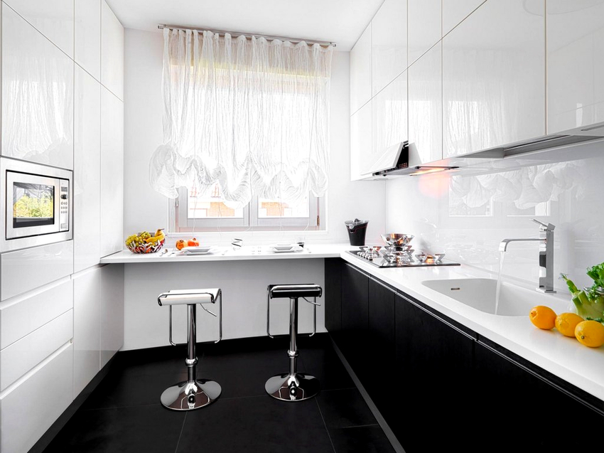 A bemutatott lehetőség mind kicsi, mind tágas helyiségek számára alkalmas, és önálló tervezési technikaként szolgálhat. Az anyagok, árnyalatok megfelelő megválasztásával, valamint más bútordarabokkal történő kombinációval az ablak melletti pulttal ellátott konyha eredeti és stílusos szobává alakítható.