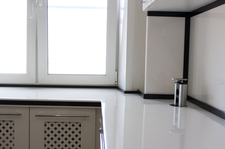 Ha az ablakpárkány magasabb szinten van, mint a munkalap, akkor a felső és az alsó szerkezet közötti rést gyakran cseréppel díszítik, vagy lábazattal zárják le. Melyik opciót választják, csak a konyha kialakításának jellemzőitől függ. Ha a belső ablakpárkányokról beszélünk, érdemes megjegyezni, hogy ugyanabból az anyagból készülnek, mint a munkalap.Sőt, további polcként szolgálnak. Ha úgy döntenek, hogy az ablakpárkányt eredeti változatában hagyják, akkor azt a lejtő szélességére vágják.