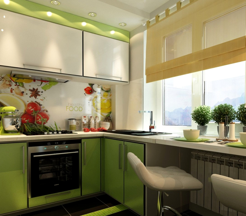 A konyhában az egyik legsikeresebb megoldás egy asztallapos ablakpárkány. Ebben az esetben a szabad helyet a lehető leghatékonyabban tudja felhasználni, mind az ablakok alatt, mind az ablak szintjén.