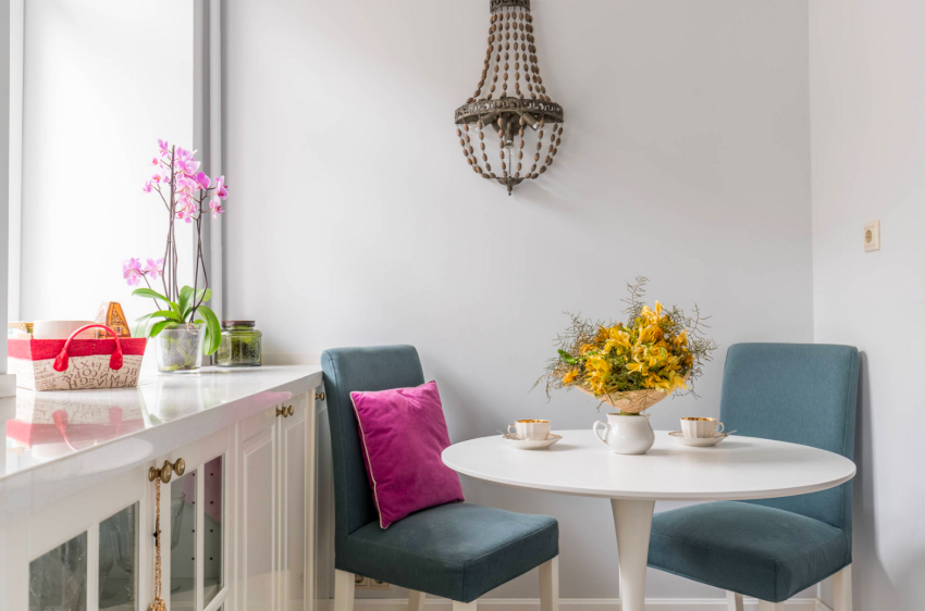 Az üres asztallap pozícionálási módszer kényelmes, több fős kis családok számára, és lehetőséget nyújt a helytakarékosságra, amennyire csak lehetséges. Az ablakpárkányra eső sziget stílusú asztallap lehetővé teszi a székek két oldalra történő elhelyezését, ezáltal sok vendég elhelyezését teszi lehetővé.