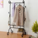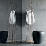 A gardrób akasztók masszívnak és masszívnak tűnnek. Ez egy olyan szerkezet, amelyet remegve lógó ruhák tárolására terveztek. Az akasztók fejei egy speciális kereszttartón vannak rögzítve, bevágásokkal vagy hegesztett golyókkal, így egy ilyen modell kialakítása szükségszerűen tartalmaz egy magas és hosszú rudat a ruhákhoz. Az ilyen típusú padlómodellt leggyakrabban szabványos kivitelben mutatják be. Ez egy két tartóval ellátott rack, amelyeket egy keresztirányú rúd-keresztléc kapcsol össze.