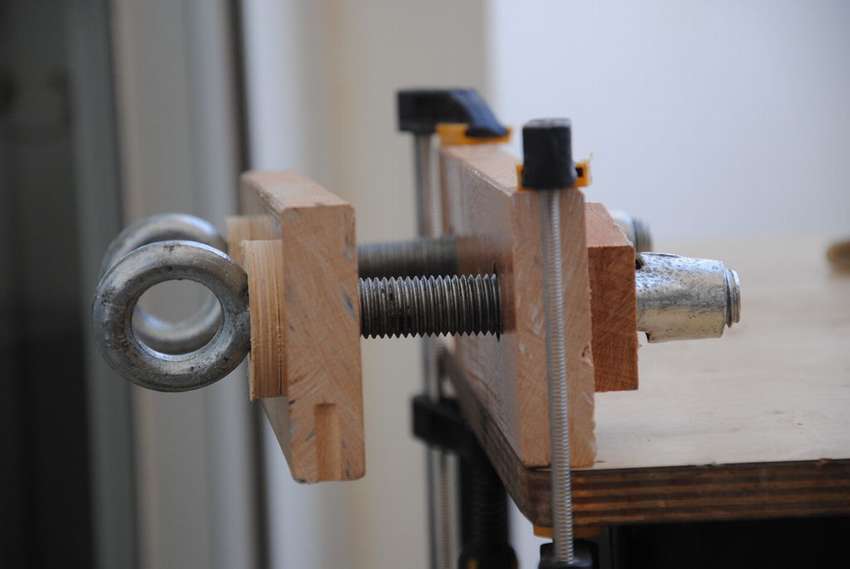 Pour rendre le travail aussi pratique que possible, l'étau est vissé sur l'établi.Ensuite, un simple écrou de meuble est attaché à la moitié fixe pour le vissage ultérieur du goujon. Ce dernier, à son tour, sera responsable de la mobilité du mécanisme. L'étape suivante consiste à fixer la rondelle sur la mâchoire mobile et à attacher la clé à la poignée. Les pointes d'éponge elles-mêmes peuvent être fabriquées à partir de contreplaqué ordinaire.