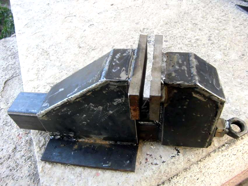 Un petit patch avec quatre trous pour la fixation est soudé à l'extrémité du goujon. Ensuite, l'épingle à cheveux est vissée sur la mâchoire fixe, et son extrémité sur la mâchoire mobile. La structure finie elle-même est attachée à l'établi.
