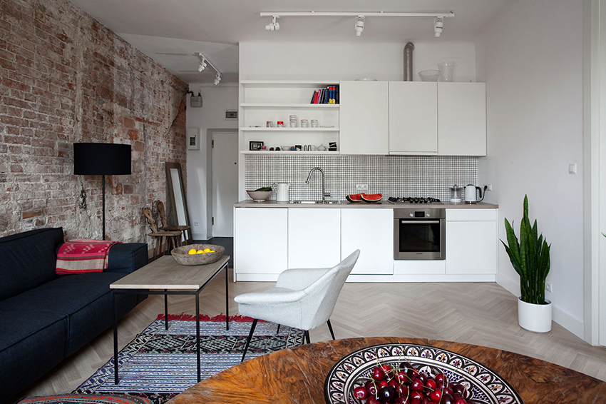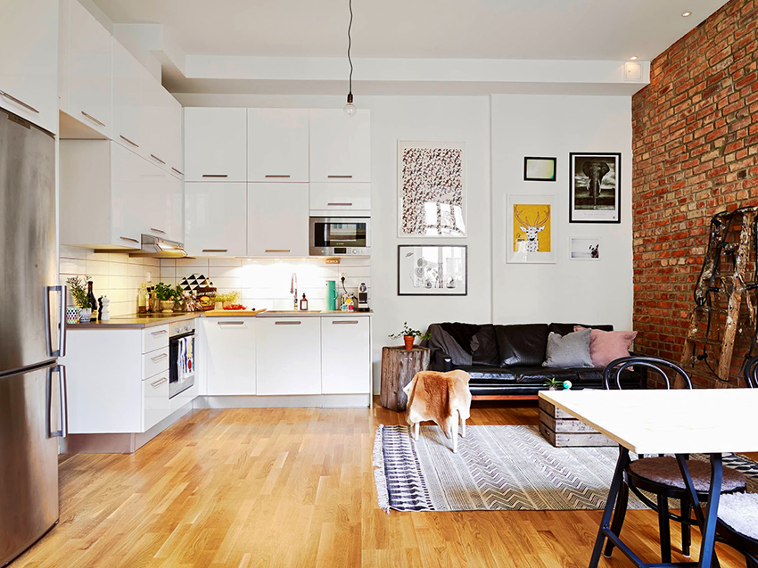 במצב בו המטבח משולב עם סלון בסגנון לופט, מומלץ להניח אריחי קרמיקה "דמויי עץ" על רצפת שני החדרים. במקרה זה, יש צורך לספק מראש נוכחות של רצפה חשמלית או מחוממת מים, ובאזור הספה, אתה צריך לשים שטיח.