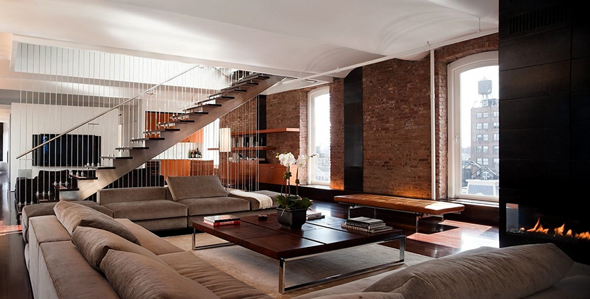 - נוכחות של נדבך שני. בתצלום של סלונים בסגנון לופט, לעיתים קרובות ניתן לראות גרם מדרגות המוביל לקומה השנייה, או למפלס העליון, שם יש חדר שינה או פינת ישיבה עם ספה. ניתן לתכנן את גרם המדרגות כמבנה מתכת פשוט או להפוך אותו לתפקודי עם מגירות במדרגות.