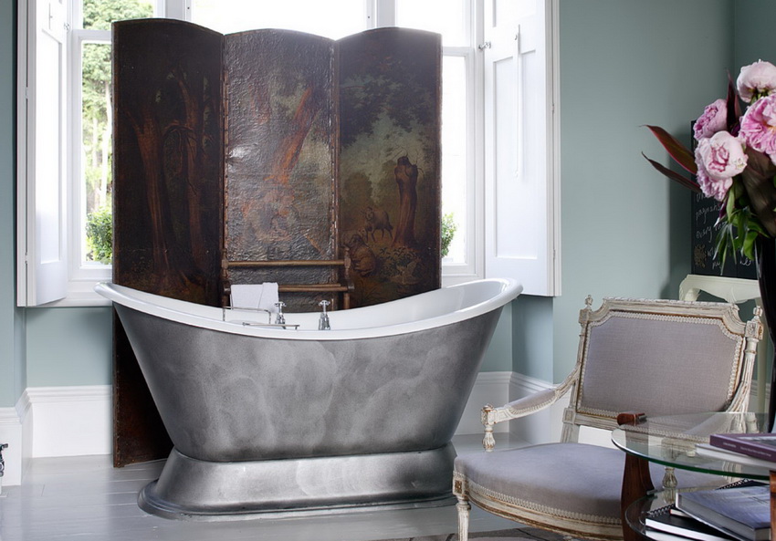 מחיצת מסך מתקפלת נוחה מאוד להתקנה בחדר אמבטיה מרווח עם חלון: היא יכולה לשמש כווילון לחסימת פתח חלון או, על ידי הזזתו, ליצור מקום לחדר הלבשה קטן. ניתן להתקין מסך עם כיסים לאחסון אביזרי אמבטיה קטנים, ועל ידי ציידת המחיצה בווים, נוח להניח עליה בגדים ביתיים.