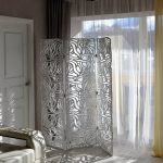 מסך שנבחר במיומנות עשוי מסגרות עץ מכוסות בד משי לא יכול לשמש רק כמפריד לחדר, אלא גם להדגיש את הטעם המעולה של בעלי הבית. בעזרת מסך כמעט חסר משקל-מחיצות אתה יכול לאזן חזותית בין המאסיביות של הרהיטים הראשיים ולרענן את הפנים המוכרים כבר. הדגם עם חלקים בגודל שונה נראה מעניין במיוחד.