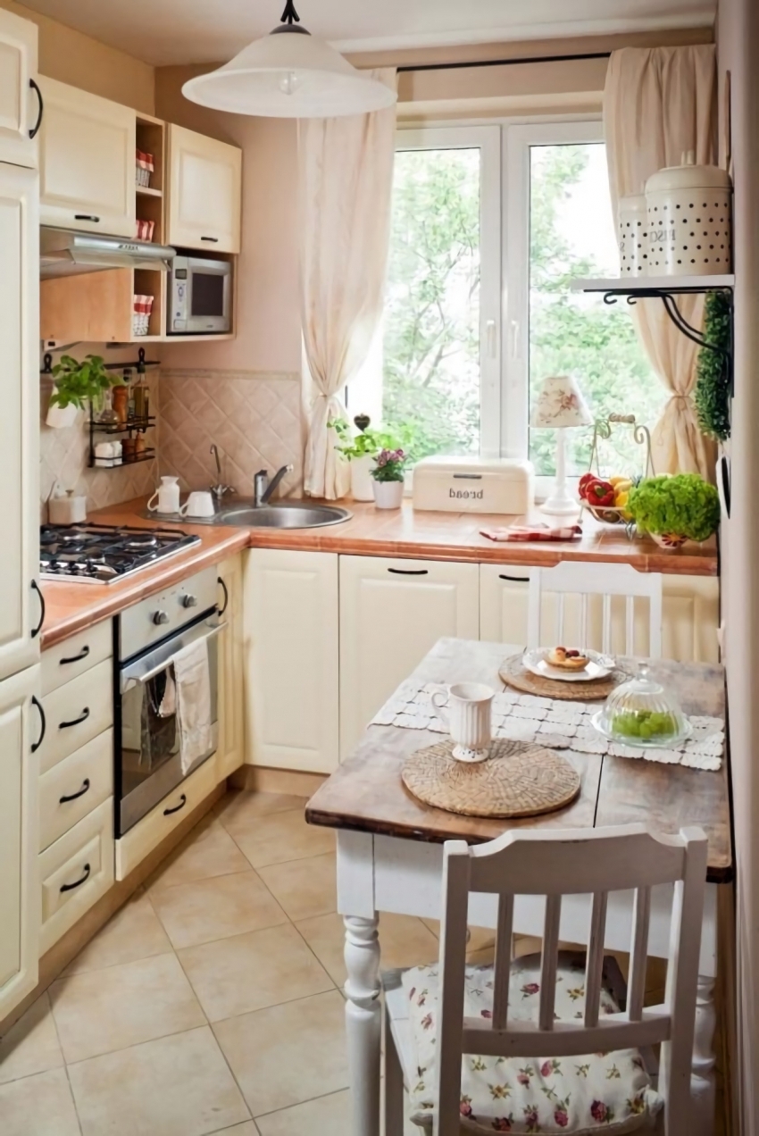 סגנון קלאסי. אפשרות זו מעולה למטבח קטן, בתנאי שלא משתמשים באלמנטים גדולים ומסורבלים מדי. לדוגמא, פשוט אין מקום למסגרות חלון מסיביות או לנברשות. עדיף לתת עדיפות לרהיטים קומפקטיים, בעיצוב לא יומרני מדי.