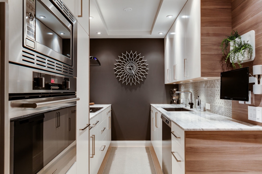 אפשרות לינה מעניינת נוספת ריהוט במטבח קטן - פריסת שתי שורות. במקרה זה, הרהיטים ממוקמים לאורך הקירות המנוגדים, לרוב מחלקים אותם לפי מטרה: מצד אחד הם תופסים את המשטחים לבישול, ומצד שני, ישנם אזורי האוכל והנופש.