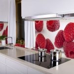 - optivayt - זכוכית המתקבלת כתוצאה מתהליך ההלבנה. אין לו גוון כחלחל או ירקרק אופייני ולכן הוא מושלם ליצירת סינרים עם דוגמה קלילה ומפורטת. בהירות הזכוכית מאפשרת לשכפל אפילו את האלמנטים הקטנים ביותר של המצע בפירוט.אך חשוב להבין כי תצטרך לשלם עבור מאפיינים כאלה, ועלות הזכוכית האופטית תהיה גבוהה פי 1.5-2 מהמקובל. צילום של מטבח עם סינר מזכוכית דובדבן ממחיש בצורה מושלמת כמה ציור יכול להיות בהיר וברור.