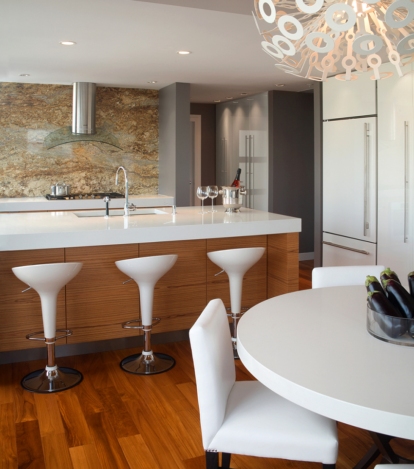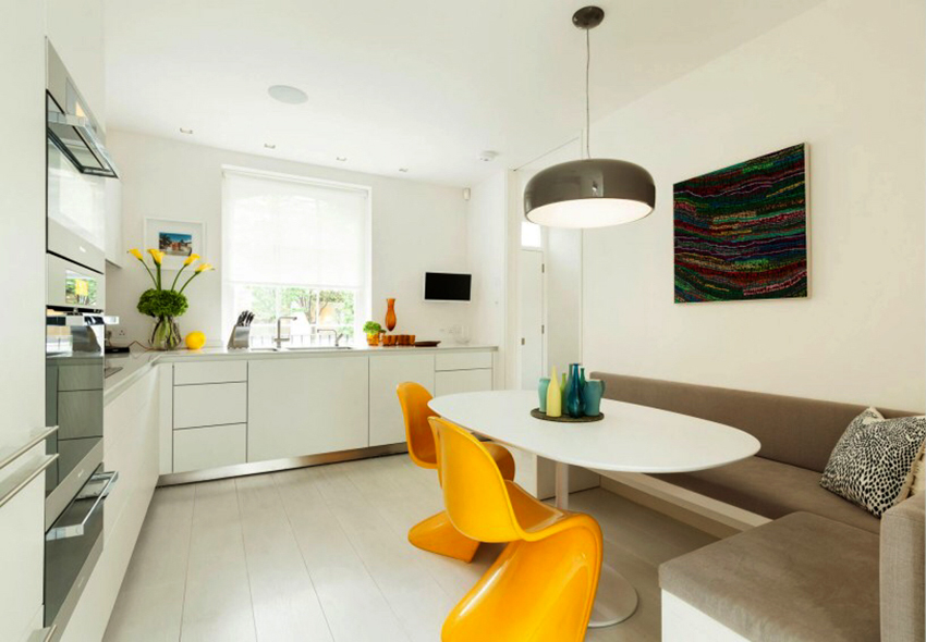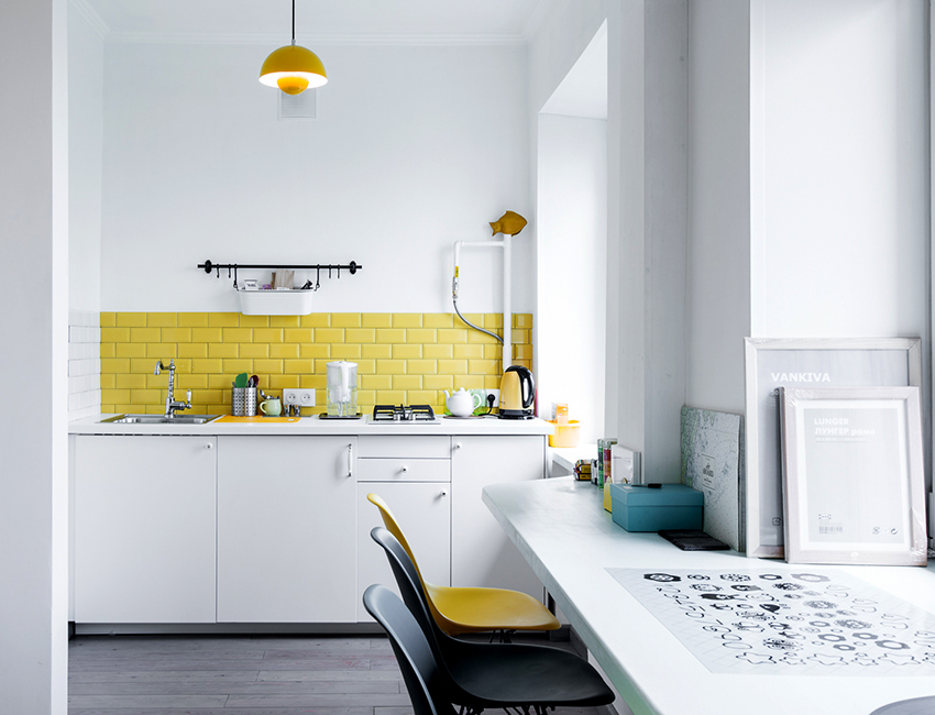 חזיתות לבנות מבריקות המשקפות אור הן אידיאליות ליחידות מטבח. בנוסף, הם יהפכו את החדר לעדין, מסוגנן ואלגנטי. התאורה משתמשת בנורות רגילות על חוטים ארוכים מעל שולחן האוכל ותאורת התקרה בסלון. אזור העבודה מצויד בתאורה מקומית.