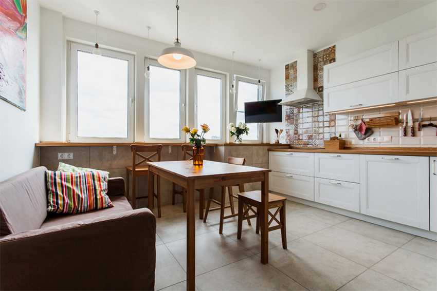 מקרר ומכשירים אחרים הם לבנים. כל הפריטים מובנים באוזניות. משטח העבודה מיוצג על ידי חלק עליון מעץ אלון מולבן מלא, והגב עשוי עשוי אריחי קרמיקה לבנים. ערכת האוכל מורכבת משולחן וכיסאות בגוון זהה למשטח המטבח ולרצפה. רצוי שזה היה אלון מולבן.