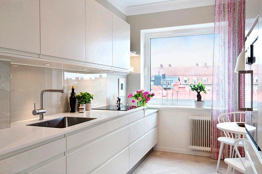 קישוט חלונות הוא אלמנט חשוב בפנים המטבח. הסגנון הסקנדינבי של דירה מניח היעדר מוחלט של וילונות וילונות, מכיוון שהמאפיינים החשובים ביותר של סקנדי הם פתיחות וחופש מעודפים, כמו גם שימוש מקסימאלי בתאורה טבעית. זה נכון במיוחד לגבי מטבח קטן. עם זאת, תושבי הקומות הראשונות לא יכולים להסתדר בלי אמצעי הגנה, אחרת הם לא יכולים להימנע ממבטים מוזרים של שכנים ועוברי אורח.