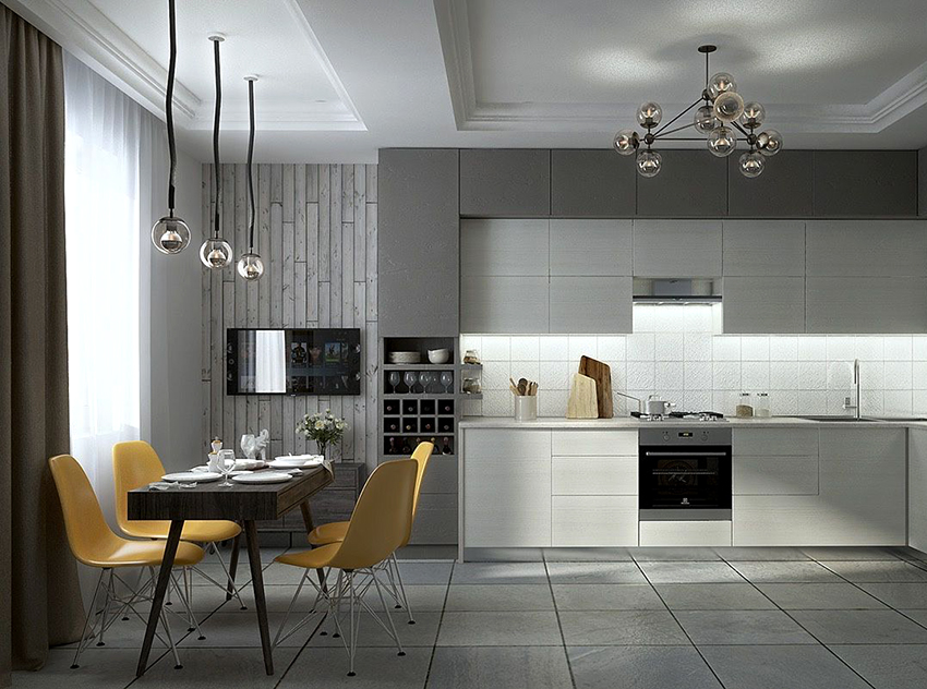 מטבח סקנדינבי אפור הוא גם מאוד פופולרי, מכיוון שצבע זה שורר בנופים של נורבגיה, שבדיה ופינלנד בצורה של ערפל, עננים, יער סתיו בערב, סלעים, אבנים וכבישים. ניתן להציג אפור בגוונים שונים: