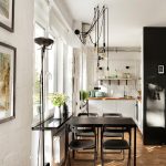 ניתן לראות בכמה תמונות גם את עיצוב הקיר במטבח, המתבצע באמצעות מראות המופרדות על ידי לוחות מתכת שחורים. פתרון עיצובי כזה לא רק מגדיל את החדר באופן חזותי, אלא גם יוצר את האפקט של חלון נוסף. בשנים האחרונות הביצועים של לוח מראה משופע זכו לפופולריות, שאף ניתן להשתמש בהם על עלה דלת.
