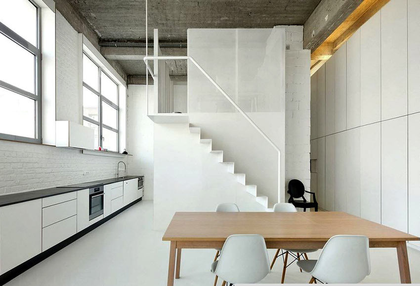לבן, בניגוד לגוונים בהירים או כהים, נחשב לפיתרון win-win בעת קישוט מטבח, שכן קל יותר לסדר את כל פרטי הפנים ולבחור אביזרים, והצבע הבהיר אינו מגרה את העיניים. למטה תוכלו לראות תמונה של מטבחים בסגנון לופט בדירה ובבית, עשויה בצבעים לבנים ובהירים.
