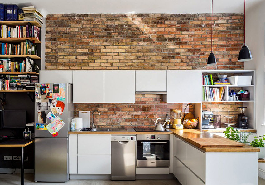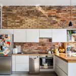 קיר לבנים נחשב למרכיב ייחודי של תפאורה במטבח, אך אין לעשות את כל הקירות בחדר מחומר זה. כמו כן, לא מומלץ להשתמש בלבנה לקישוט סינר למטבח. עֲלִיַת גַגכי קשה לטפל בזה. הרבה יותר פרקטי להשתמש באריחי קרמיקה, ואפשר גם להדביק טפט עם דפוס המחקה לבנים על הקיר ולכסות אותו בזכוכית עמידה וקל לתחזוקה. יש לבחור את האריח בצורה כזו שתשתלב בצורה הרמונית עם הרקע הכללי של הדירה ולא תמשוך תשומת לב יתרה לעצמו.