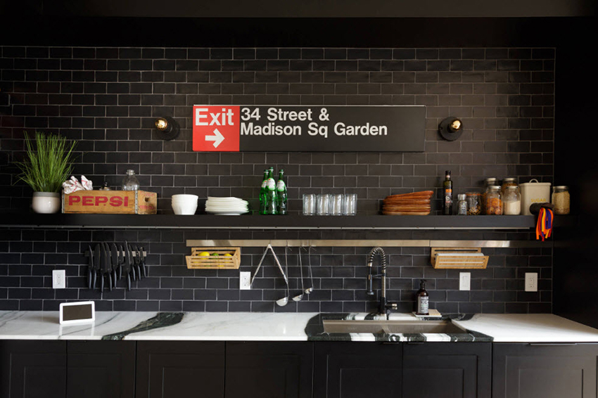 טפט אפור עם גרפיטי יוסיף מקוריות לחדר, אשר תדלל את הפנים המחוספס בצבעים עזים. פתרון יוצא דופן יהיה לקשט את אחד הקירות בסרט שחור שעליו תוכלו לצייר בגיר, להשאיר פתקים חשובים או להשתמש בו ליצירתיות של ילדים. להלן תמונות של עיצובי קירות במטבח תוך שימוש בטקסטורות וחומרים שונים.