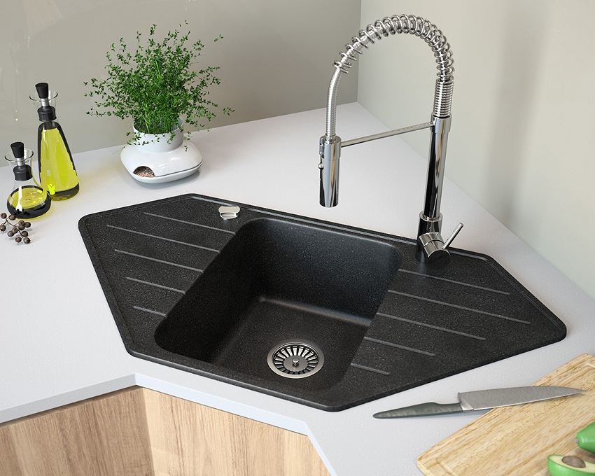 - הכיור הזוויתי מעניק למטבח סגנון מסוים. על ידי בחירת הצורה יוצאת הדופן של הכיור וצבע האבן המלאכותית, תוכלו ליצור פנים שתמיד תרגישו די בנוח.