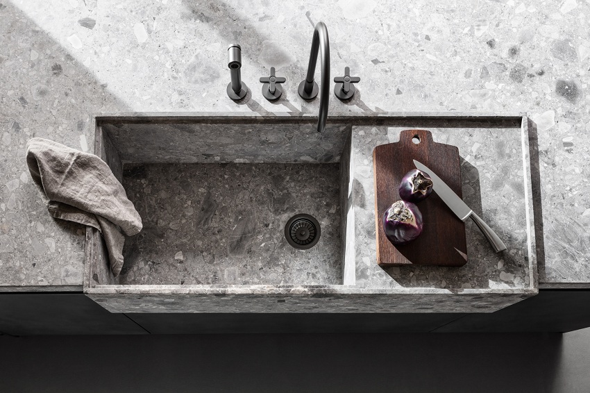 לייצור כיורי אבן למטבח משתמשים בתרכובת הכוללת אלמנטים מילוי ומליטה. מינרלים טבעיים ממלאים תפקיד מילוי, וחלקיקיהם משולבים עם שרפים. הרכב המורכב הוא בדרך כלל כדלקמן: