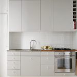 מטבח מאובזר ישר עובר לאורך אחד הקירות הארוכים. אפשרות זו משמשת למשפחות קטנות בהן אין צורך להכין כמויות גדולות של אוכל. בעזרת סידור רהיטים זה ניתן יהיה לארגן מינימום מכשירי חשמל ביתיים. עם זאת, במקרה זה, אתה יכול לארגן פינת אוכל מלאה עם ספה או כיסאות אפילו בחדר קטן.