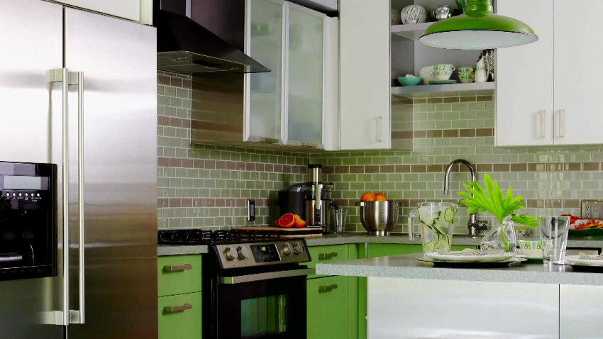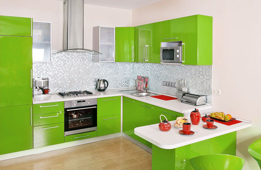 עצה מועילה! גוון עסיסי של ירוק בהיר נחשב מאוד קליט ובהיר, ולכן יש לקשט רק דבר אחד בצבע זה: הקירות או קבוצת המטבחים. אם תגזימו, המטבח יהיה מגוון מדי.