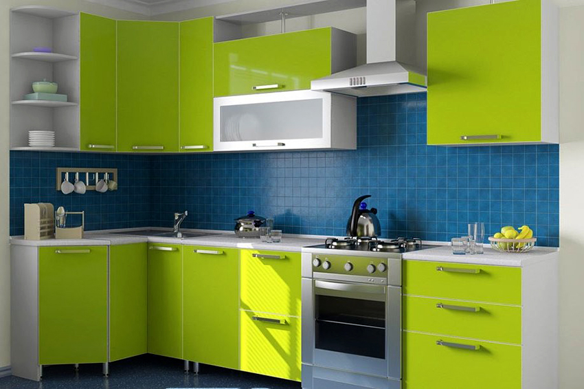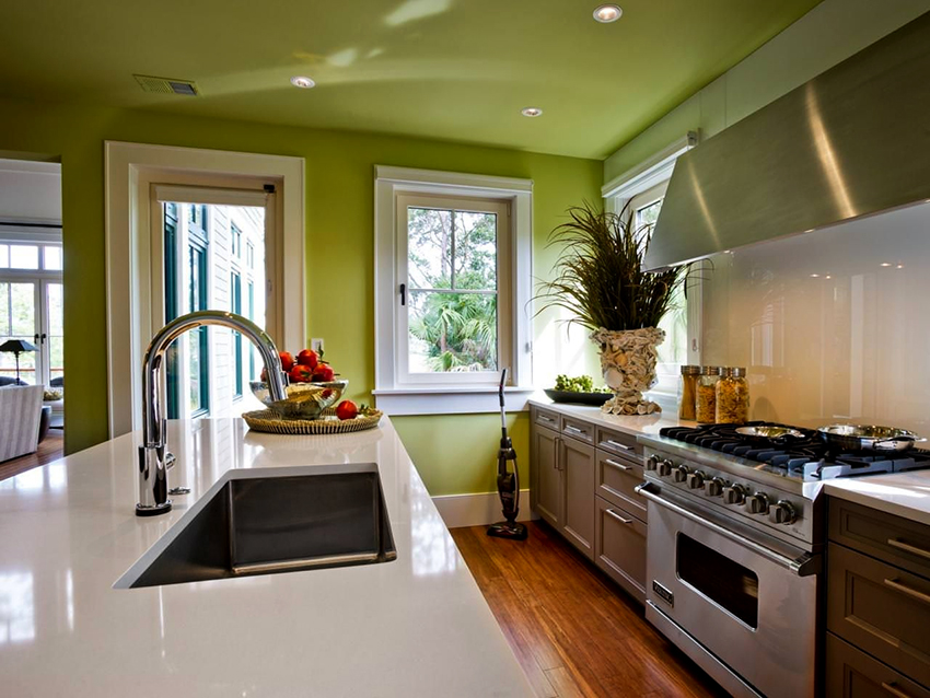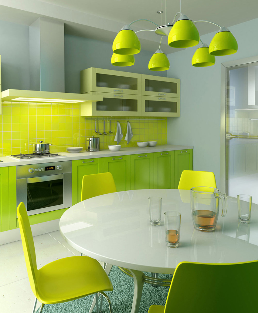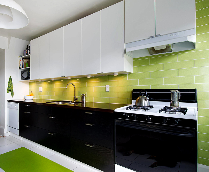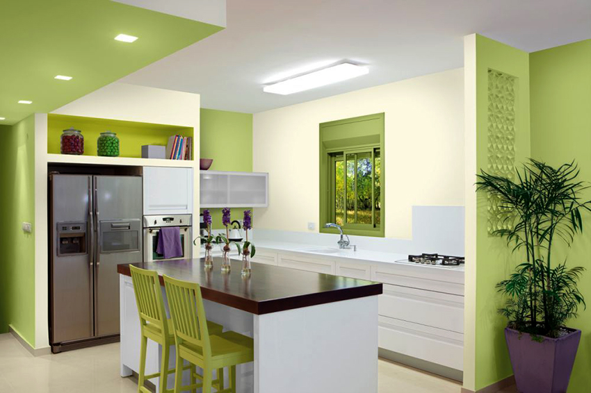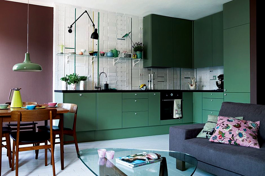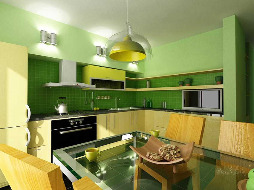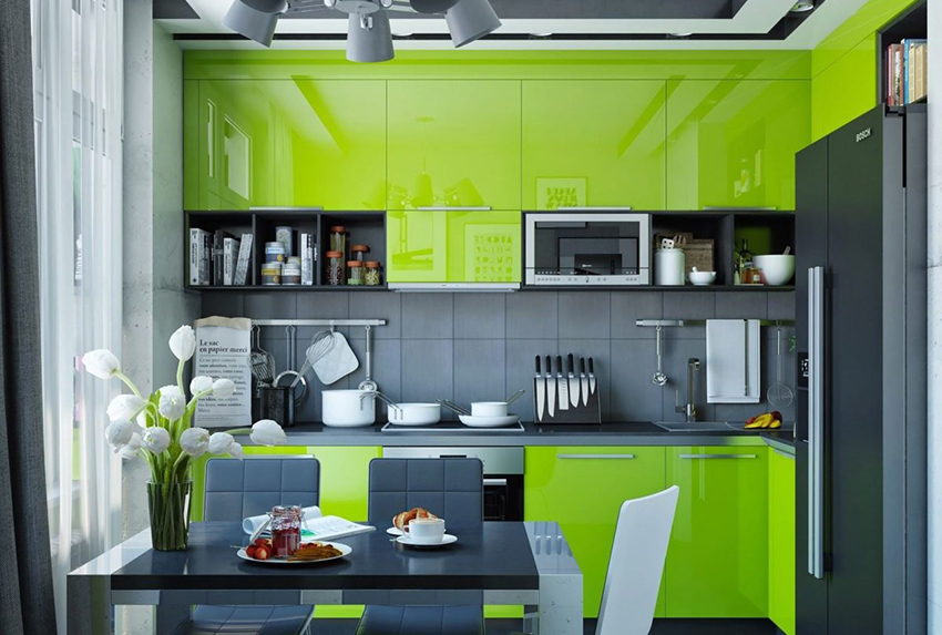 מטבח ירוק בהיר משמח ואינו מאמץ את העיניים, ויש לו גם השפעה חיובית על מצבו הנפשי של האדם. הדרישה העיקרית היא להקפיד על איפוק ולא להגזים עם שימוש בגוונים מגוונים, מה שעלול להרגיז. מומלץ להשתמש בצבע ירוק רעיל (מה שמכונה ניאון) בזהירות יתרה, תוך בחירה מדויקת של פרטים, הגבלת מספרם לגבולות סבירים.