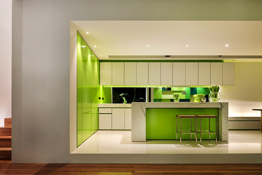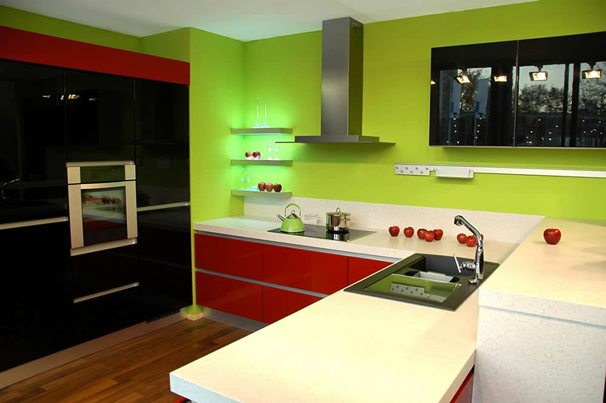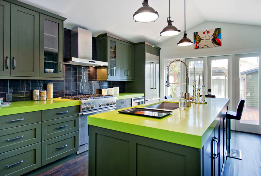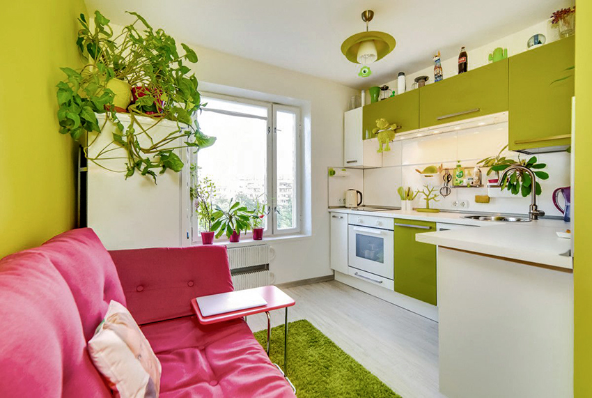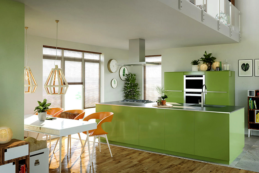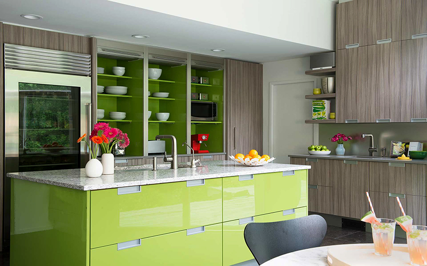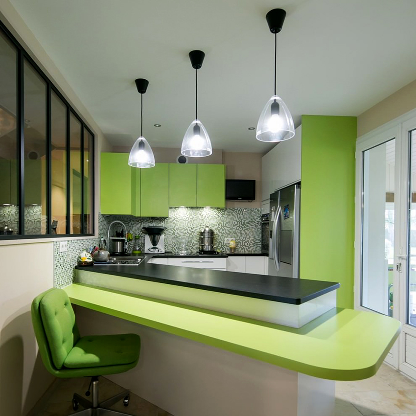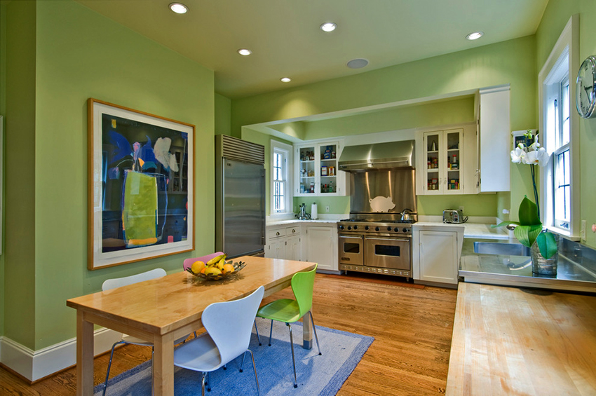 מטבח ירוק בהיר משמח ואינו מאמץ את העיניים, ויש לו גם השפעה חיובית על מצבו הנפשי של האדם. הדרישה העיקרית היא להקפיד על איפוק ולא להגזים עם שימוש בגוונים מגוונים, מה שעלול להרגיז. מומלץ להשתמש בצבע ירוק רעיל (מה שמכונה ניאון) בזהירות יתרה, תוך בחירה מדויקת של פרטים, הגבלת מספרם לגבולות סבירים.