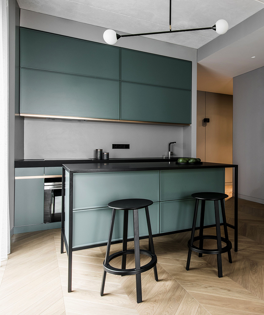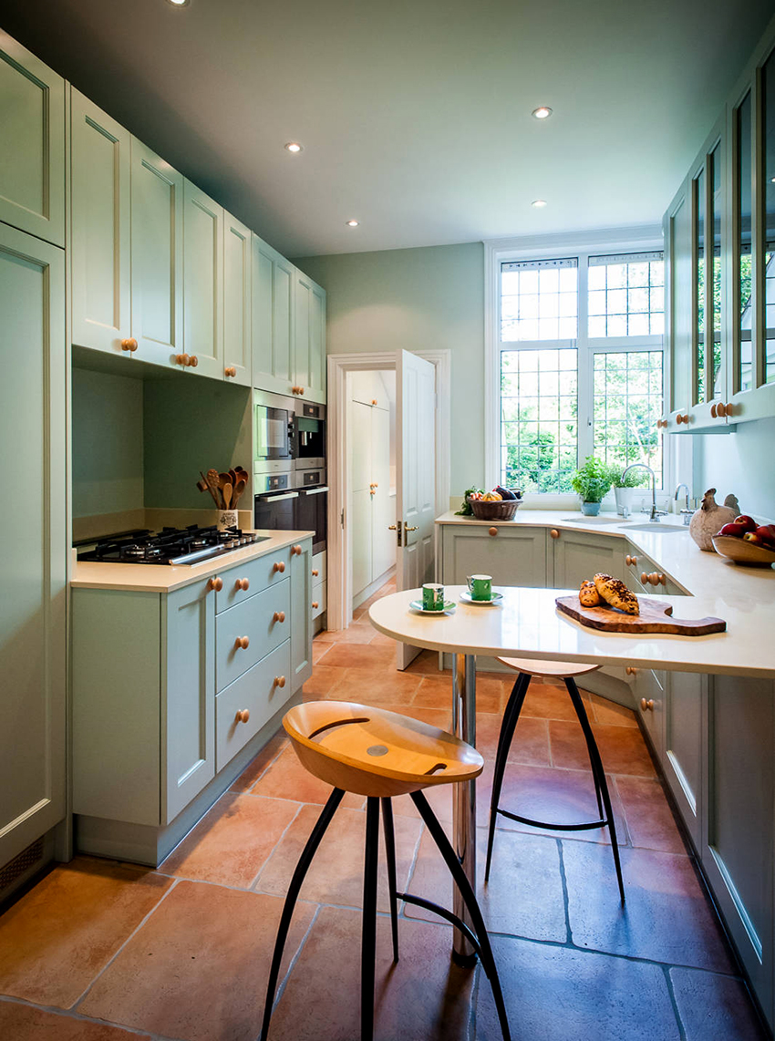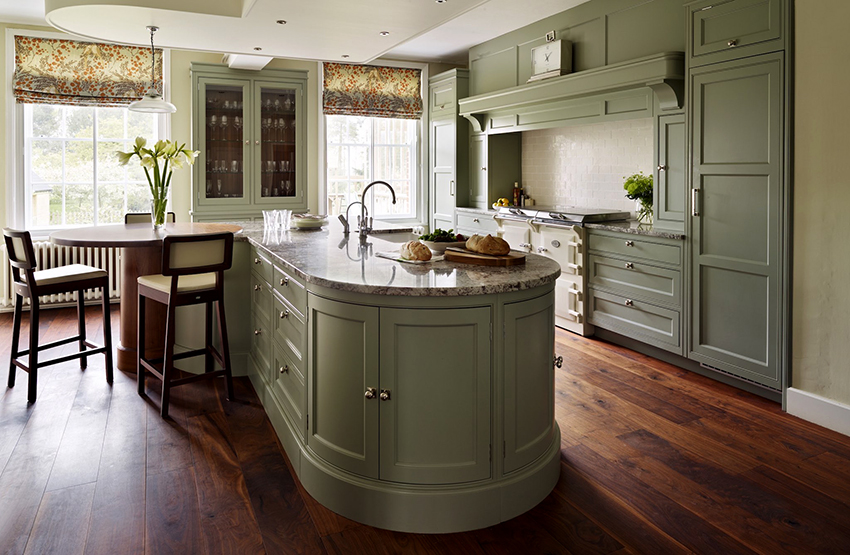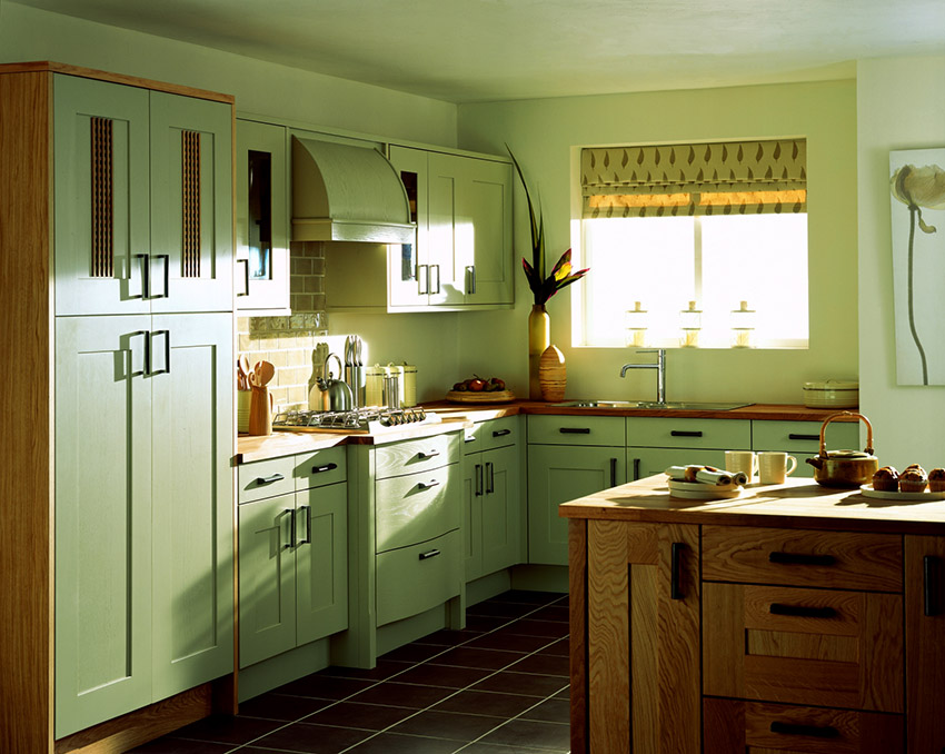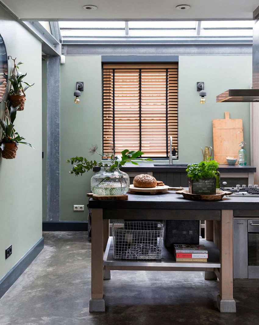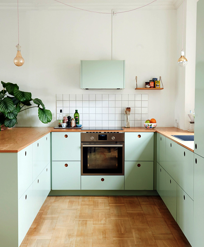 - ירוק חיוור הוא טון רגוע שיוצר אווירה של רוגע ושלווה במטבח.