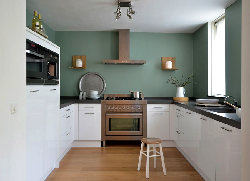 קירות ירוקים בהירים הם רקע טוב הן לאוזניות כהות והן לאור. העיקר שהריהוט פשוט ופונקציונלי. רהיטים עם חזיתות כהות על רקע קירות ירוקים בהירים נראים מרשימים, ואילו סט תאורה יהפוך את המטבח לרענן ועליז. קיר מבטא בהיר יכול להחיות את פניםו של חדר מונוכרום לבן, בעוד שמותר להשתמש בצבע או טפט לקישוט הקיר. עדיף שהקיר יהיה מלא או עם דוגמאות גיאומטריות פשוטות.