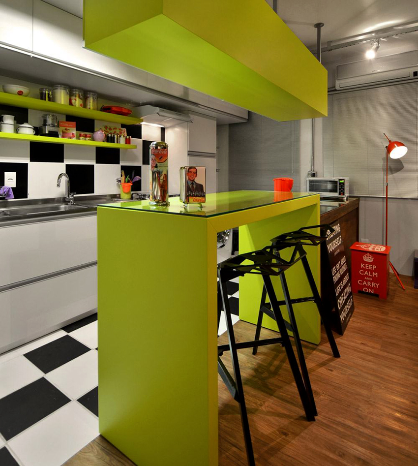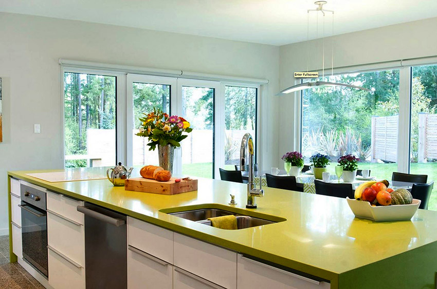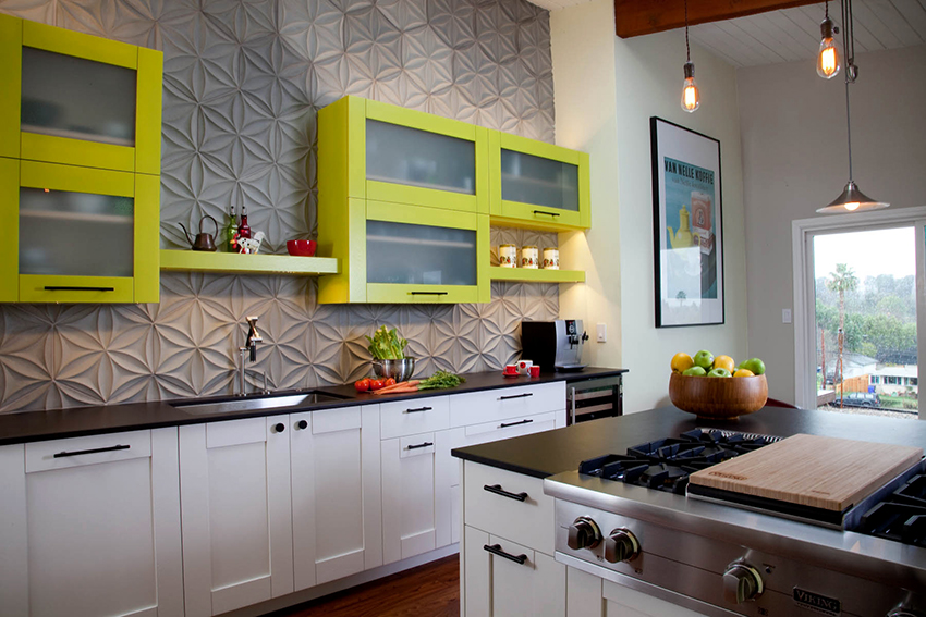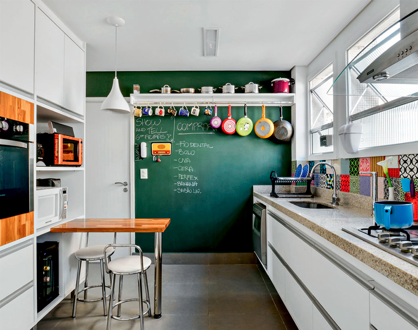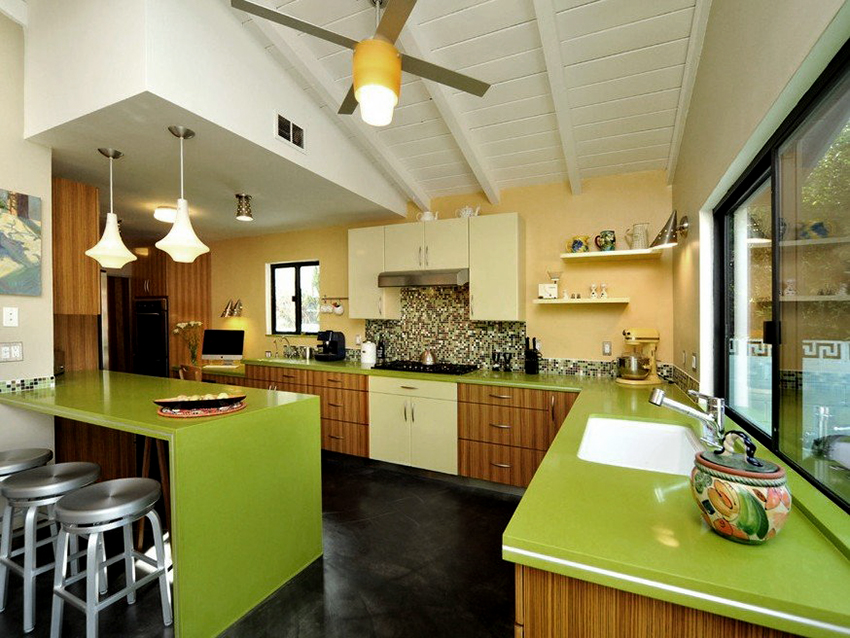 יש אנשים שמעדיפים להשתמש בגווני חומצה בהירים ורוויים, המשולבים עם משטחים המיוצרים באותו הסגנון. העיקר הוא לוודא שיהיה נוח להיות במטבח כזה. סינר בצבע ניטרלי נחשב לאופציה אוניברסלית, שבעיצובו יש כמות קטנה של ירוק עז.
