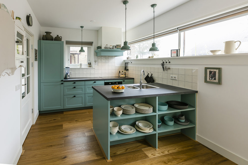 - מטבח כחול-ירוק יעורר אסוציאציות עם העולם. בכל מקרה, השילוב נחשב להרמוני ומיושם בהצלחה בכל פרופורציה.