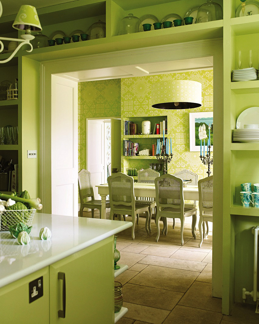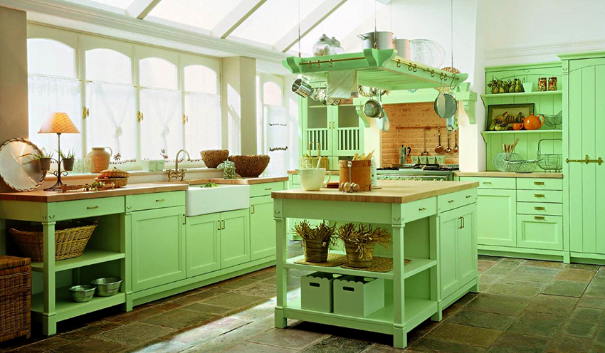 מטבח ירוק מעורר אסוציאציות לאביב ולקיץ כאשר הטבע מתמלא בירקות טריים. פנים כזה תמיד נראה עסיסי ומשפיע לטובה על מצב הרוח של האנשים בחדר. בנוסף, תזונאים טוענים כי לצבע של ירקות צעירים יש השפעה מיטיבה על התיאבון ומשפר את העיכול. מסיבה זו, מומלץ במיוחד להשתמש בגוונים ירוקים בדירות בהן גרים ילדים קטנים שקשה להאכיל אותם.
