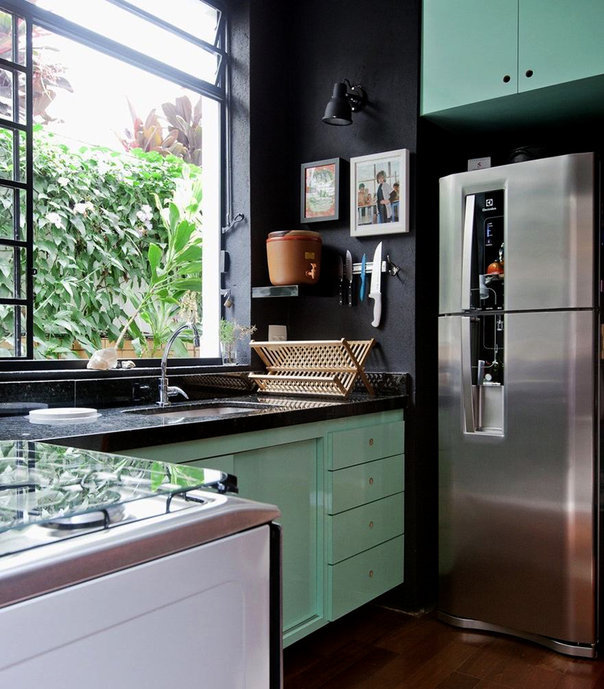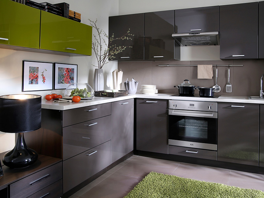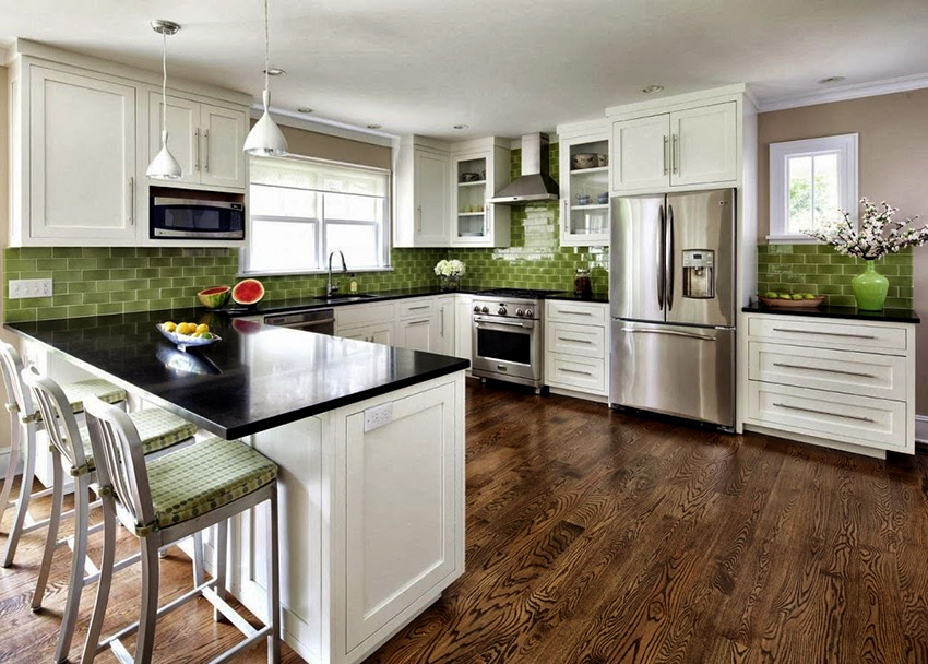 השילוב של צבעים שחורים וירוקים נראה מסוגנן ומרשים עם גוונים נבחרים היטב. השימוש בשחור מאזן את מהומת הירוקים ומוסיף את הניגוד הדרוש לחדר. גוונים ירוקים, לעומת זאת, מדללים את הצבע השחור הכהה. לקישוט, מטבח פינתי ירוק מתאים, אותו משלים משטח שחור קפדני. שילוב כזה ייראה אורגני במיוחד בפנים העשויים בסגנון הייטק או מינימליזם.