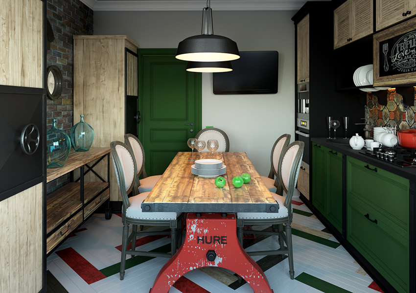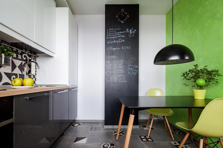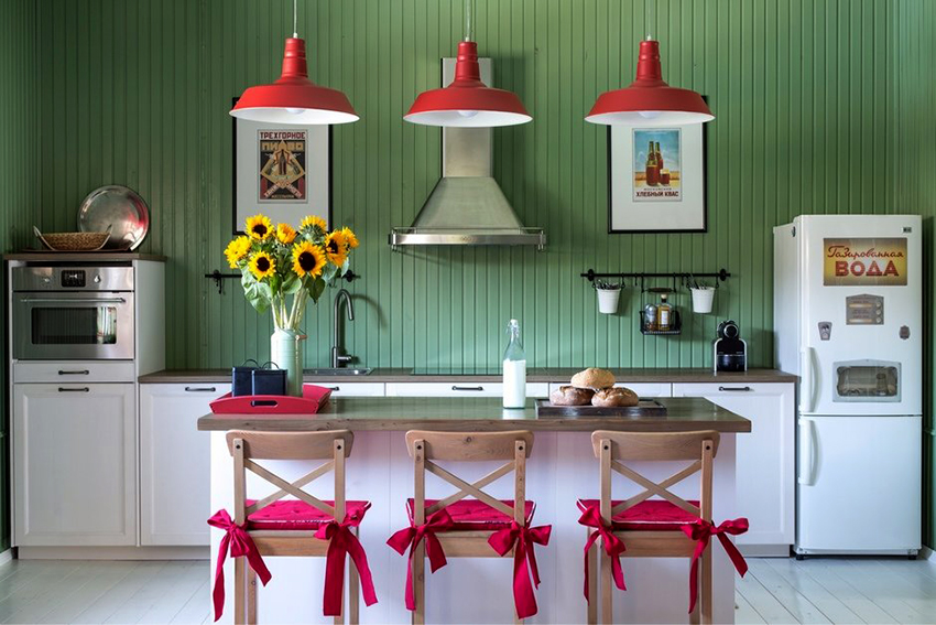 עצה מועילה! אם אתה מסתכל בתמונות של מטבחים ירוקים, שבפנים שלהם הקירות והרצפה עשויים בצבע ירוק, אז אתה יכול לשים לב לעובדה שכל המשטחים מתמזגים לשלמות אחת. זה נותן רושם של קירות דחוסים. כדי למנוע זאת, עליך להשתמש במינון צבעוני. אם הקירות ירוקים, רצוי להשאיר את הרצפה והתקרה לבנים.