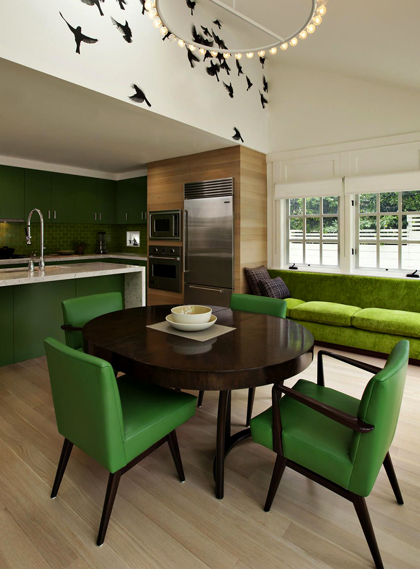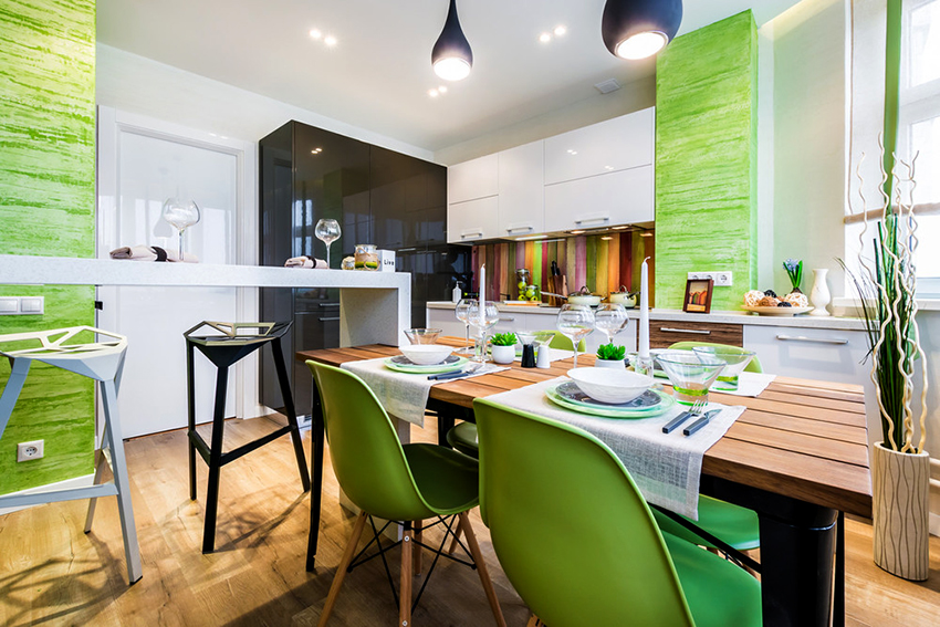 - להדגשת פינת האוכל, עדיף להשתמש בשולחן עם זכוכית עם כיסאות ירוקים סביבו.