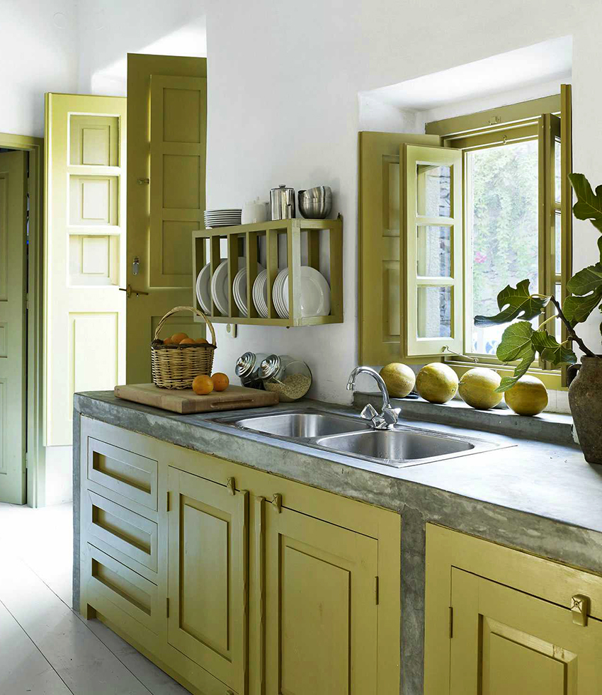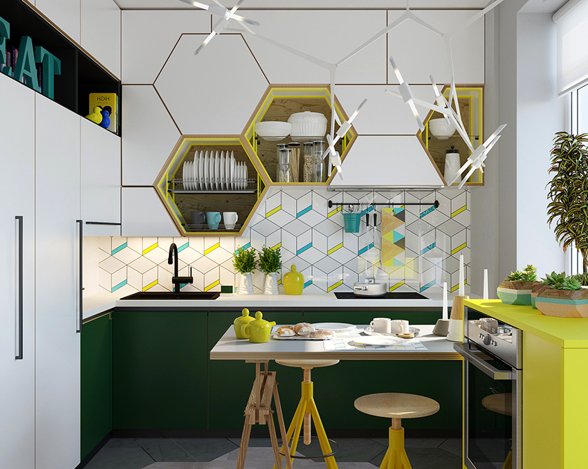 המטבח הצהוב-ירוק נראה אורגני מאוד, מכיוון שבטבע שילוב זה נמצא לרוב ונחשב הכי קרוב לבני אדם. השימוש בצבעים צהוב וירוק קשור לעתים קרובות למדי שן הארי באחו או לקרני השמש הבהירות הזורחות מבעד לכתר הירוק של עץ. מטבח ירוק עם פרטים צהובים יבטיח מצב רוח טוב, במיוחד במזג אוויר גשום או קר. עם זאת, חשוב לקחת בחשבון שנוכחות כמות גדולה של צהוב מעוררת את התיאבון, לכן, אם יש בעיות עם עודף משקל, נדרש למינון כמות הגוונים הצהובים.