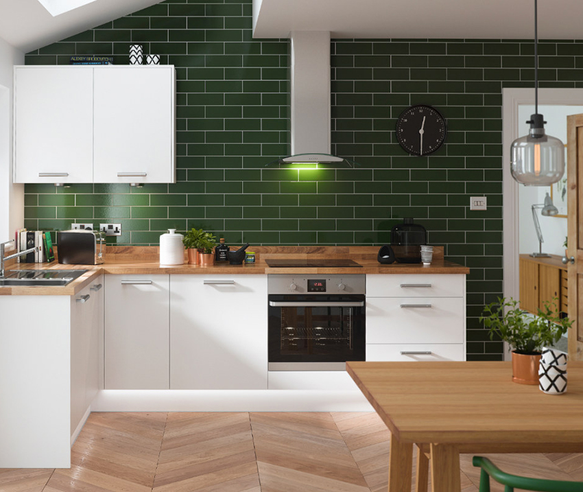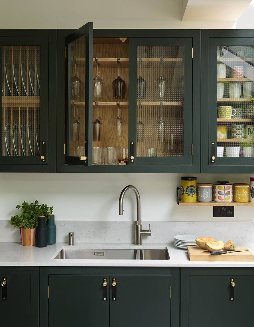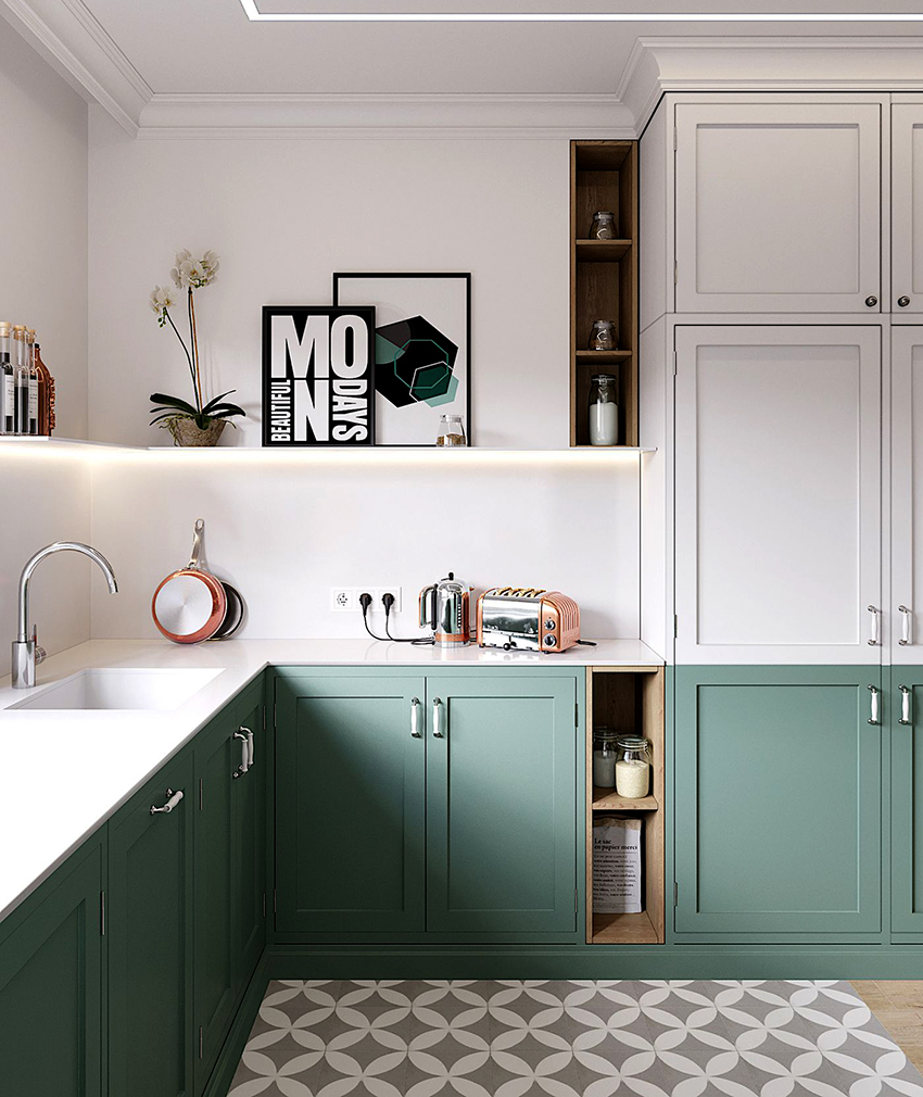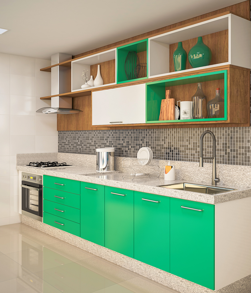 - יש להשתמש בגוונים שונים של ירוק לקישוט הארונות העליונים והתחתונים של קבוצת המטבחים.